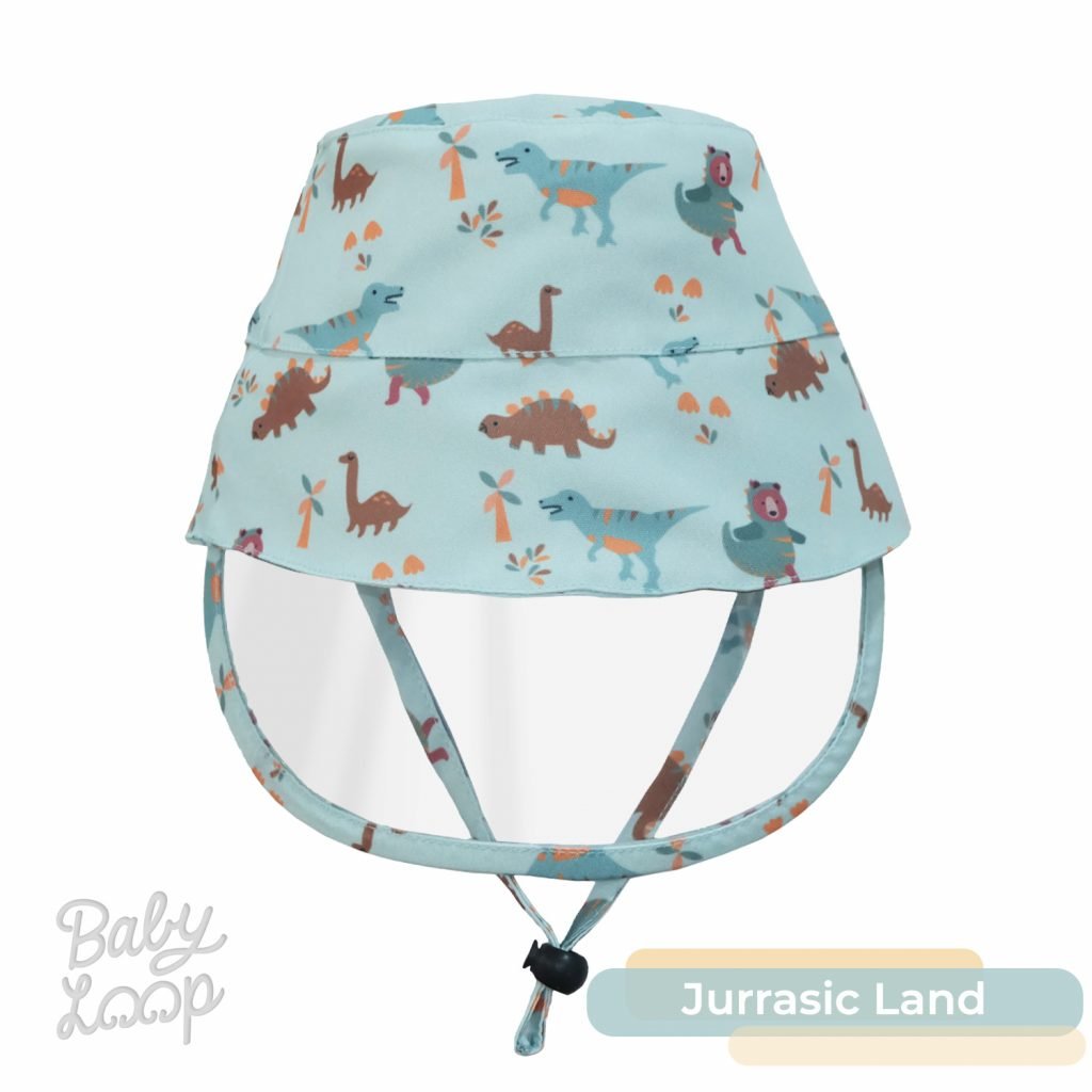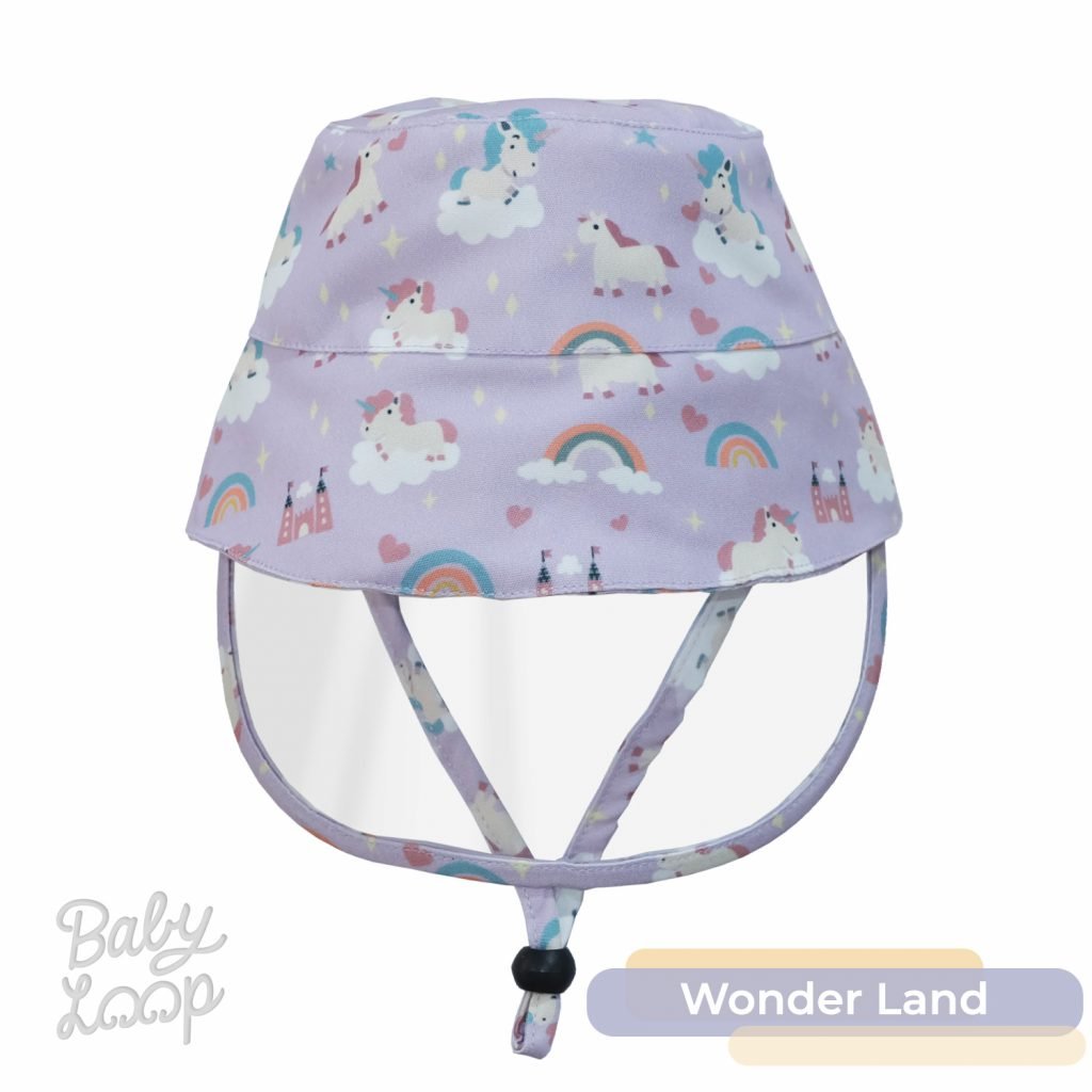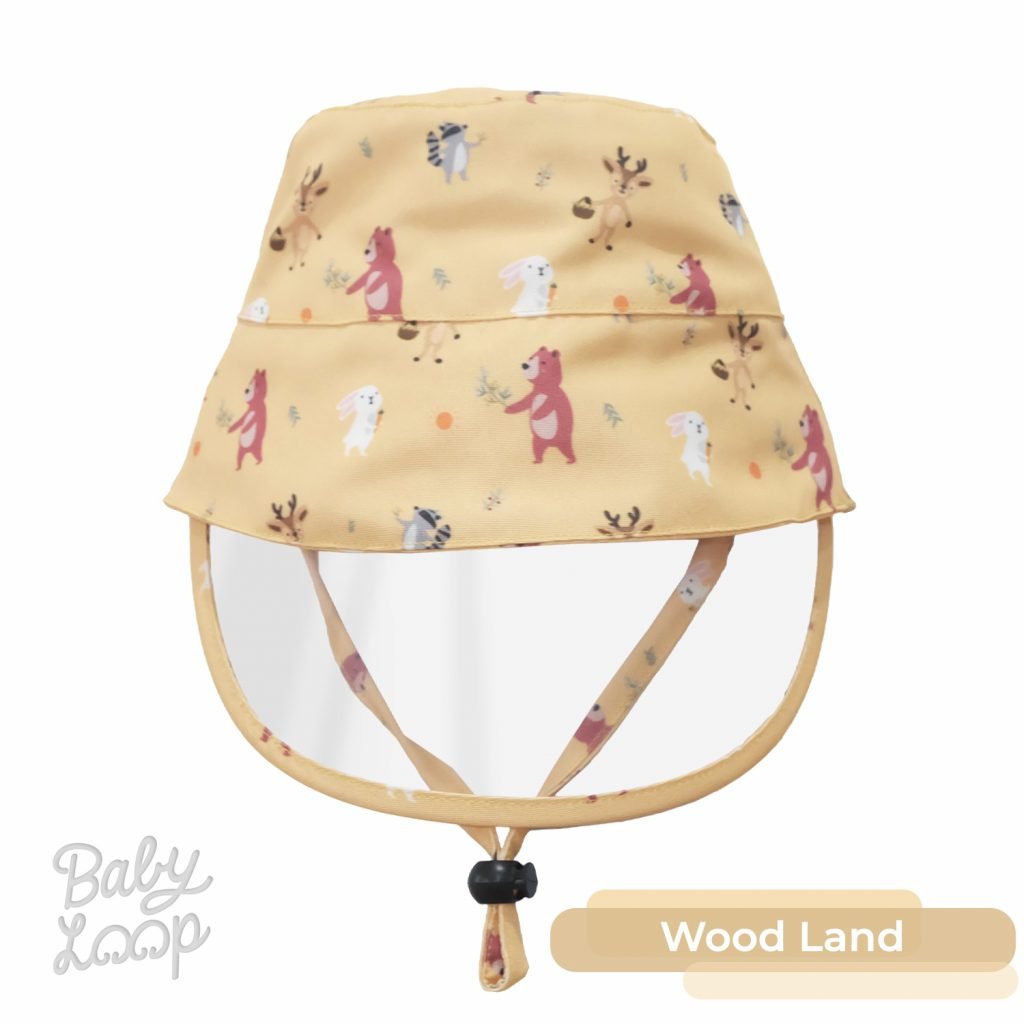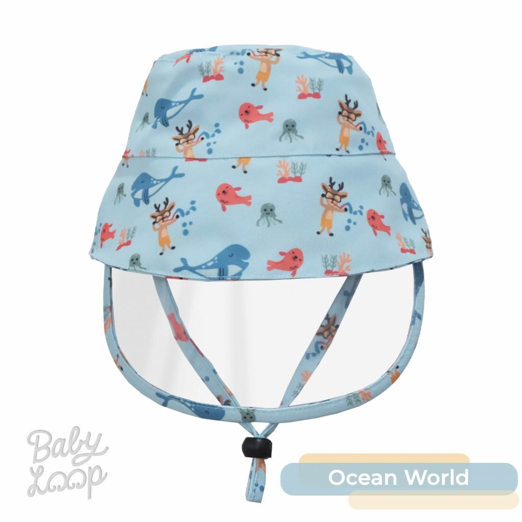Topi bayi/anak model bucket style retro dengan bordir karakter Baby Loop pada bagian kiri, detail tali dan stopper, dan dilengkapi dengan shield.