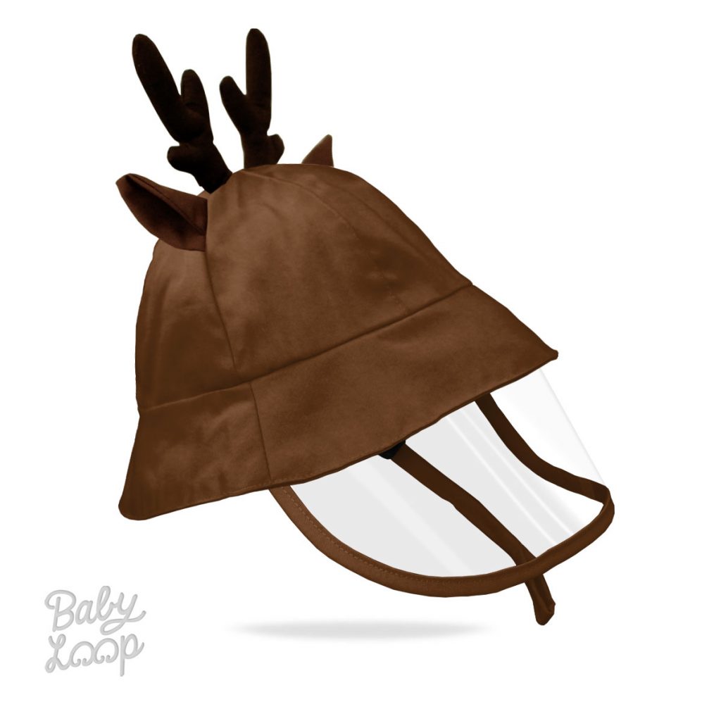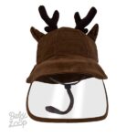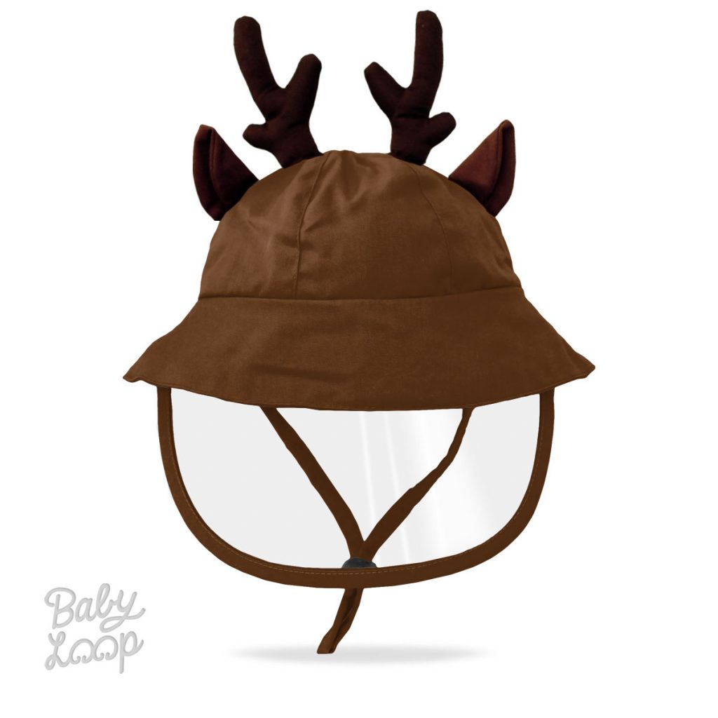 Topi bayi/anak model bucket dengan aksen telinga dan tanduk rusa, detail tali dan stopper, dan dilengkapi dengan shield.