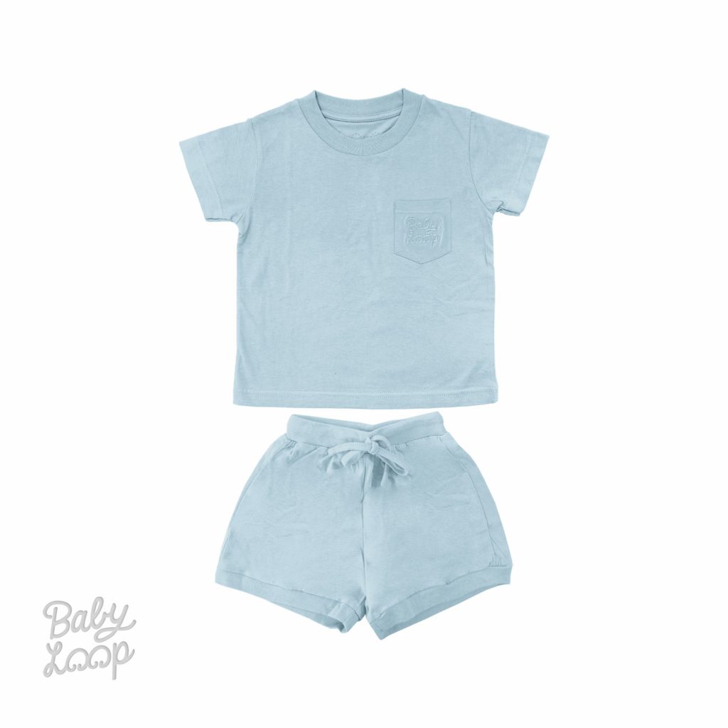 Playsuit Baby Loop terbuat dari katun bambu dengan serat yang sangat lembut, menyerap keringat, anti bakteri dengan desain dan warna yang menarik. Baju lengan pendek, kerah berbentuk bulat, dengan bordir khas Baby Loop pada bagian saku, dan celana pendek bertali.